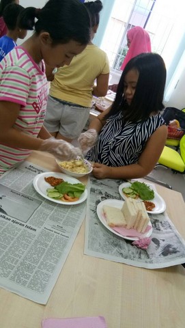 Sebelum membuat sandwich, staff PI Bengoh telah menyediakan bahan-bahan terlebih dahulu. Mereka diajar mengutamakan kebersihan sebelum menyentuh bahan-bahan masakan. Setiap peserta dibekalkan sarung tangan setiap seorang. Selepas itu, mereka diberi tunjuk ajar oleh staff PI Bengoh untuk membuat sandwich telur dan sandwich sardin. Kemudian, mereka dibahagikan kepada 4 kumpulan beserta bahan-bahan untuk membuat sandwich. Para peserta diberi peluang untuk membuat sendiri sandwich. Aktiviti ini membantu para peserta belajar masakan mudah yang boleh dipraktikkan semasa di rumah.