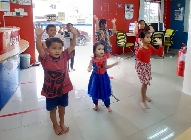 Aktiviti dimulakan dengan aktiviti senam -aerobik yang menggunakan lagu “A ram sam sam” dan “Chicken dance”. Lagu ini sangat popular dalam kalangan kanak-kanak dan ia mempunyai rentak tarian yang mudah serta irama lagu yang lancak. Senaman tarian ini dilakukan sebagai satu cara untuk menggalakkan kanak-kanak bersenam dan menyegarkan mereka dalam cara yang menyeronokkan bersama rakan-rakan.