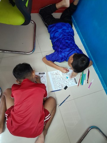 Aktiviti diteruskan pula dengan aktiviti mewarna. Bersempena dengan sesi persekolahan yang baru sahaja bermula awal bulan ini. Kami menyediakan aktiviti berwarna bertemakan “Back to School”. Dalam aktiviti ini bukan sahaja mengasah kreativiti mereka untuk berseni tetapi juga memupuk semangat bekerjasama dalam kalangan mereka.
