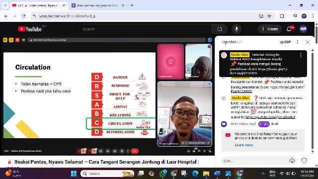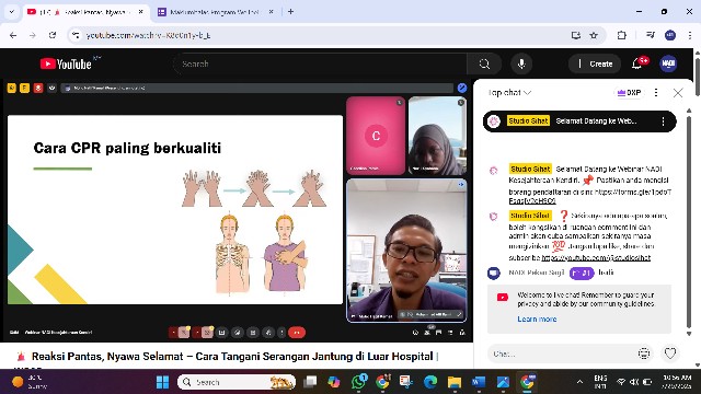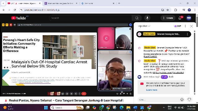 Webinar ini disediakan secara atas talian melalui google meet. Peserta juga boleh menonton secara live di Youtube live, saluran Studio Sihat dan Facebook live: NADI Malaysia. Melalui webinar ini, kita dapat pelajari cara untuk tangani serangan jantung melalui pertolongan kecemasan, CPR (Cardiopulmonary resuscitation).