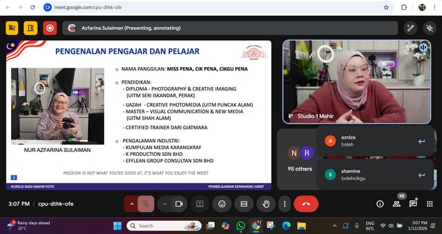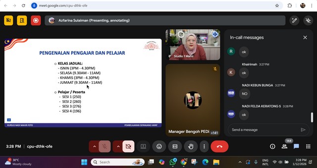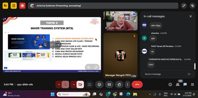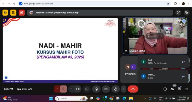 Sesi pembelajaran telah dilaksanakan secara dalam talian melalui aplikasi Google Meet. Para peserta digalakkan untuk hadir ke premis NADI bagi memanfaatkan kemudahan yang disediakan secara percuma.