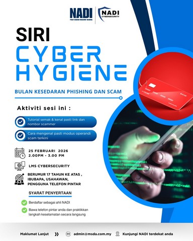 Pada 25 Februari 2026, Rabu – Seramai dua orang peserta telah menyertai program Siri Cyber Hygiene sempena Bulan Kesedaran Phishing dan Scam yang dianjurkan oleh Pusat Sebaran Maklumat Nasional (NADI) dengan kerjasama NADI Cybersecurity. Program ini telah berlangsung dari jam 2.00 petang hingga 3.00 petang menerusi platform LMS Cybersecurity.