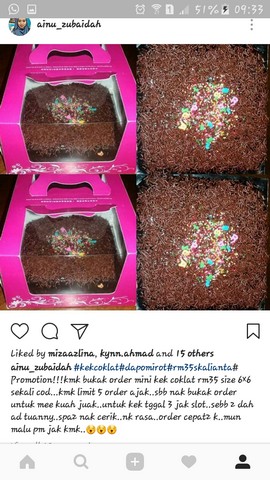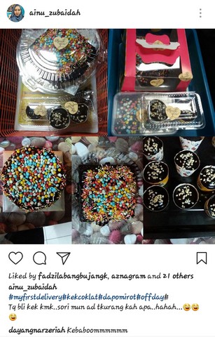 Cik Ainu Zubaidah merupakan usahawan dalam talian yang menjual produk-produk makanan seperti kek coklat, dan mee kari. Beliau mempunyai minat yang mendalam terhadap dunia perniagaan dan berhasrat untuk mempromosikan servis penghantaraan makanannya ke atas talian. Beliau akan mengambil tempahan pada masa tertentu. Sebarang pertanyaan boleh menghubungi beliau di talian 019-8240942